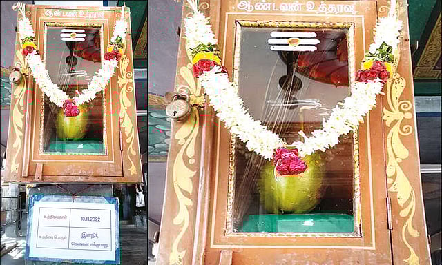 இந்த நிலையில் திருப்பூர் மாவட்டம் காங்கயம் தாலுகா முத்தூர் அருகே மங்களப்பட்டியை சேர்ந்த குமாரசாமி (வயது 55) என்ற பக்தரின் கனவில் உத்தரவான இளநீர், தென்னை ஈக்குமாறு நேற்று முதல் வைத்து பூஜிக்கப்பட்டு வருகிறது. இதற்கு முன்னதாக ஆண்டவன் உத்தரவு பெட்டியில் கடந்த அக்டோபர் மாதம் 6-ந் தேதி முதல் வேல் வைத்து பூஜிக்கப்பட்டு வந்தது.