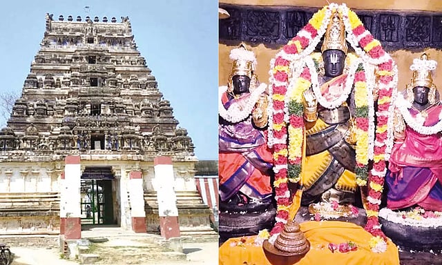ஊரின் உட்புறம் உயரிய மதில்கள் கொண்டு, ஏழு கலசங்களுடனான ஐந்து நிலை ராஜகோபுரம் கிழக்கு பார்த்தவாறு கம்பீரமாக காணப்படுகிறது, ஆலயம். கணபதி ராஜகோபுரத்தின் கீழே வடக்கு முகமாக காட்சி தருகிறார். வெளிப் புறத்தில் நந்தவனம் அமைக்கப்பட்டு, மிகவும் ரம்மியமாக உள்ளது. தென்கிழக்கில் மடப்பள்ளி உள்ளது. நேராக பலிபீடமும், துளசி மாடமும் உள்ளன. பின் கருடாழ்வார் கரம்குவித்தபடி நிற்கிறார்.