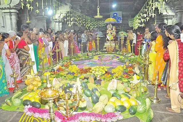 கோவிலில் இன்று காலை முதலே பக்தர்கள் கூட்டம் அதிகமாக காணப்பட்டது. பக்தர்கள் நீண்ட வரிசையில் சாமி தரிசனத்திற்கு காத்திருந்தனர். பக்தர்களுக்கு காய், கனிகள் கை நீட்டம் வழங்கப்பட்டது.