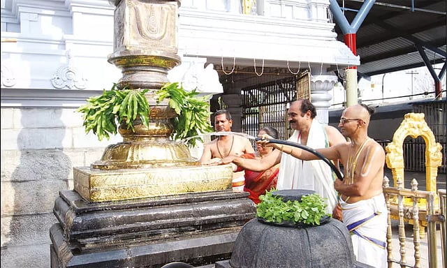 அப்போது கோவில் வளாகம், சுவர்கள், மேற்கூரை, பூஜை பொருட்கள் உள்ளிட்டவை தண்ணீர் கொண்டு சுத்திகரிக்கப்பட்டன. அதன்பின், நாமகோபு, ஸ்ரீசூர்ணம், கஸ்தூரி மஞ்சள், கற்பூரம், சந்தனப்பொடி, குங்குமம், கிச்சிலிக்கட்டி போன்ற வாசனை திரவியங்கள் கலந்த புனிதநீர் கோவில் முழுவதும் தெளிக்கப்பட்டது.
