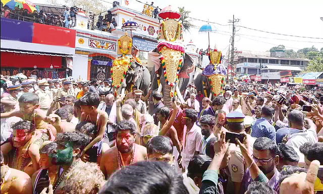 அப்போது மேள தாளம் முழங்க, ஐயப்பனின் சரண கோஷமும் எதிரொலித்தது. எருமேலி கொச்சம் பலத்தில் இருந்து வாவர் மசூதியை சுற்றி நெற்றிப்பட்டம் சூட்டிய யானையில், அம்பலப்புழை கிருஷ்ணசாமி கோவிலில் இருந்து பூஜித்து எடுத்து வரப்பட்ட ஐயப்ப விக்ரகத்தை சுமந்து வந்து காணிக்கை செலுத்தினர்.
