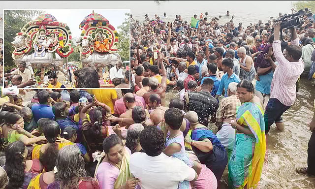 பின்னர் சிறிய பல்லக்கில் பூஜைகள் செய்து கொண்டு வரப்பட்ட அஸ்திர தேவருக்கு ஆற்றங்கரையில் வைத்து சிறப்பு பூஜைகள் செய்யப்பட்டு, அபிஷேக, ஆராதனைகள் செய்யப்பட்டன. பின்னர் அஸ்திர தேவர் காவிரி ஆற்றுக்கு கொண்டு செல்லப்பட்டு, கும்பத்தில் அபிஷேகம் செய்யப்பட்ட புனிதநீரை ஊற்றிய பின்னர், அஸ்திர தேவர் அகண்ட காவிரி ஆற்றில் புனித நீராடினார்.