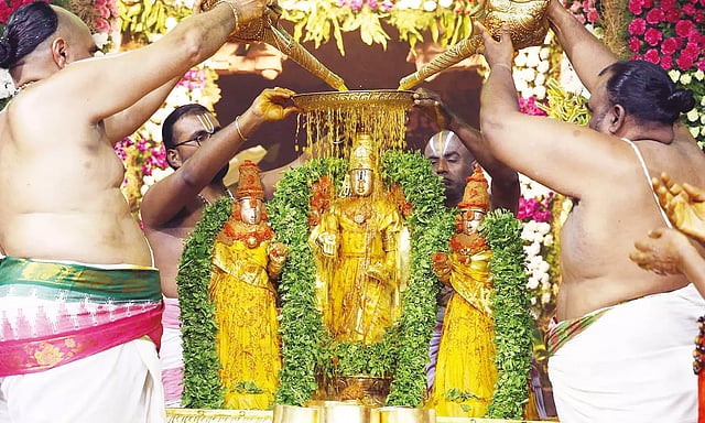 உற்சவர்களான ஸ்ரீதேவி, பூதேவி, சமேத மலையப்பசாமியை கோவிலில் இருந்து நேற்று காலை நான்கு மாடவீதிகள் வழியாக வசந்த மண்டபத்துக் கொண்டு வந்தனர். அங்கு உற்சவர்களுக்கு ஆஸ்தானமும், மதியம் 2 மணியில் இருந்து மாலை 4 மணி வரை உற்சவர்களுக்கு திருமஞ்சனமும் நடந்தது.
