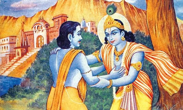 உடனே கிருஷ்ணர் இப்போது தான் பாரதபோர் முடிந்துள்ளது. இதே தோற்றத்தில் நாம் வெளியில் செல்ல வேண்டாம். அதனால் நான் ஒரு பெண்ணாக மாறுகிறேன். நீயும் என் தோழியாக மாறி செல்லலாம் என்றார்.