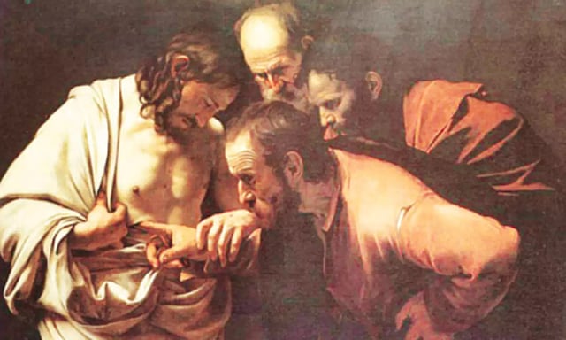 மூன்றாம் முறையாக தரிசனமானபோது தோமா அவர் களோடு இருந்தார். இயேசு தோமாவை நோக்கி, 'நீ உன் விரலை இங்கே நீட்டி என் கைகளை பார், உன் கையை நீட்டி என் விலாவிலே போடு, அவிசுவாசியாயிராமல் விசுவாசியாயிரு' என்றார் (யோவான் 20:27).