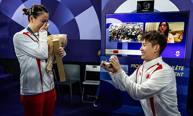 தங்கப்பதக்கத்தை வென்ற உற்சாகத்தில் இருந்த சீன வீராங்கனை ஹியாங் யா கியாங்யிடம் எதிர்பாராத நேரத்தில் அவருடன் விளையாடும் சக வீரரான லியூ யூசேன் தனது காதலை வெளிப்படுத்தினார்.