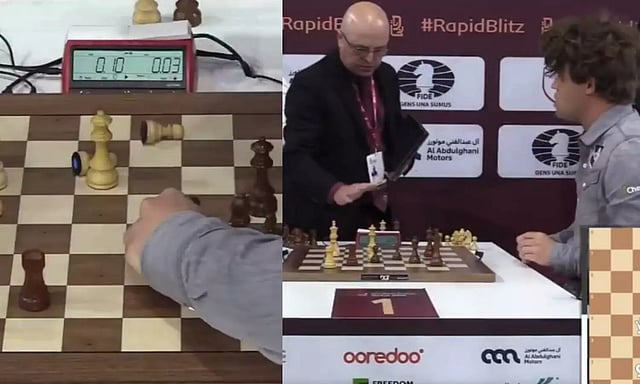 அப்போது பதற்றத்தில் கட்டத்தில் இருந்த மற்ற காய்களை தள்ளிவிட்டு விட்டார். பிளிட்ஸ் விதிப்படி, நேரம் கணக்கீட்டை நிறுத்துவதற்குள் காய்களை மீண்டும் சரியான இடத்தில் வைக்க வேண்டும். டென்ஷனில் இருந்த கார்ல்செனால் அதை செய்ய முடியவில்லை.