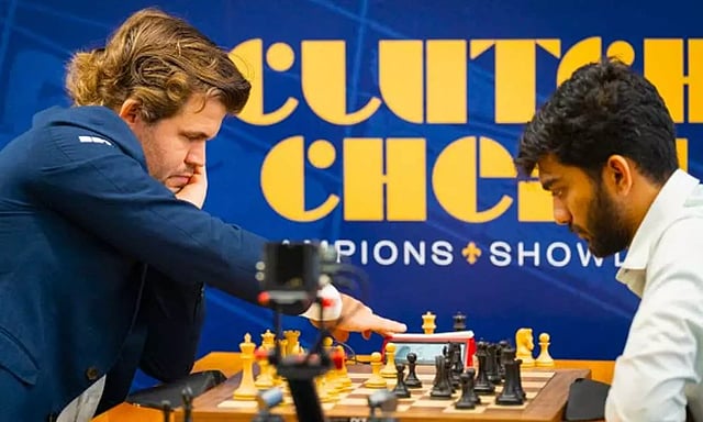 அமெரிக்காவின் செயின்ட் லூயிஸ் நகரில் கிளட்ச் செஸ் சாம்பியன்ஸ் போட்டி நடைபெற்று வருகிறது. இது உலகின் நான்கு சிறந்த வீரர்கள் பங்கேற்கும் ஒரு குறுகிய விரைவு சதுரங்கப் போட்டியாகும். இதில் இந்தியாவை சேர்ந்த குகேஷ், உலகின் நம்பர் 1 வீரர் மேக்னஸ் கார்ல்சன், ஹிகாரு நகமுரா மற்றும் ஃபேபியானோ கருவானா ஆகியோர் கலந்து கொண்டனர்.