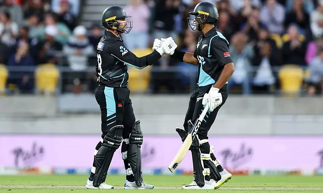 அதன்படி நியூசிலாந்து முதலில் ஆடியது. பின் ஆலன் 32 ரன்னில் அவுட்டானார். டேவன் கான்வேயுடன் ஜோடி சேர்ந்த ரச்சின் ரவீந்திரா அதிரடியாக ஆடினார். இருவரும் சிக்சர், பவுண்டரிகளாக விளாசி அரை சதம் கடந்தனர்.