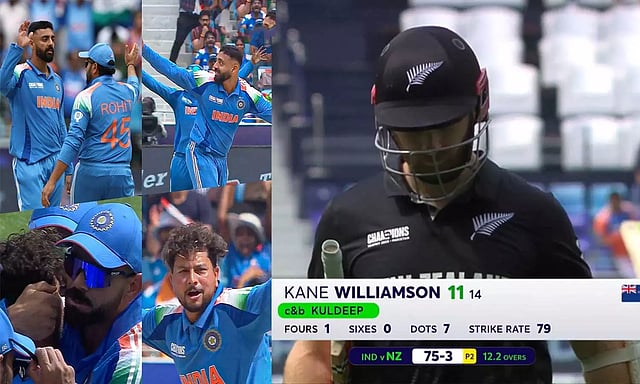 இப்போட்டியில் 8 ஆவது ஓவரை வீசிய வருண் சக்கரவர்த்தி வில் யங் விக்கெட்டை வீழ்த்தினார். இதனையடுத்து 11 ஓவரை வீசிய குல்தீப் யாதவ் முதல் பந்திலேயே ரச்சின் ரவீந்திரா விக்கெட்டை வீழ்த்தினார். அடுத்ததாக 13 ஆவது ஓவரை வீசிய குல்தீப் வில்லியம்சன் விக்கெட்டையும் வீழ்த்தி அசத்தினார்.