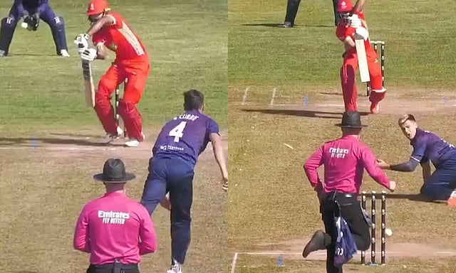 இந்த போட்டியின் முதல் பந்தில் கனடா அணியை சேர்ந்த தொடக்க வீரர் விக்கெட் கீப்பரிடம் கேட்ச் கொடுத்து ஆட்டமிழந்தார். அதன்பிறகு இரண்டாவது பந்தின் போது எதிர்புறம் இருந்த புதிய பேட்ஸ்மேன் அடித்த பந்து பவுலரின் கையில் பட்டு ஸ்டம்பில் பட்டதால் ரன் அவுட் மூலம் 2-வது தொடவக்க வீரரும் ஆட்டமிழந்து வெளியேறினார்.
