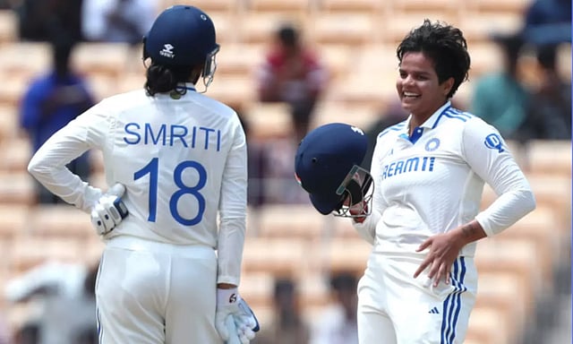 இறுதியில் முதல் நாள் ஆட்ட நேர முடிவில் இந்திய அணி 98 ஓவரில் 4 விக்கெட்டுக்கு 525 ரன்கள் குவித்துள்ளது. கேப்டன் ஹர்மன்ப்ரீத் கவுர் 42 ரன்னும், ரிச்சா கோஷ் 43 ரன்னும் எடுத்து அவுட்டாகாமல் உள்ளனர்.