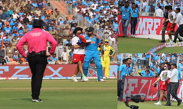 முகத்தை துணியால் மூடி, பாலஸ்தீன ஆதரவு வாசகங்களை கொண்ட டி-ஷர்ட் அணிந்திருந்த அந்த நபர் வேகமாக ஓடி, இந்திய ஆட்டக்காரர் விராட் கோலிக்கு அருகே சென்றார். அவரை நெருங்கிய அந்த நபர், ஒரு சில வினாடிகள் விராட் கோலியின் தோளில் கை போட முயன்றார். ஆனால், பாதுகாப்பு அதிகாரிகள் அவரை மடக்கி வெளியேற்றினர்.