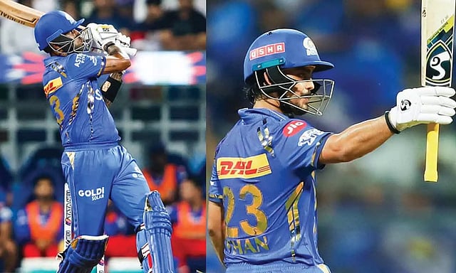 197 ரன்களை துரத்திய மும்பை அணிக்கு துவக்க வீரர்களான இஷான் கிஷன் மற்றும் ரோகித் சர்மா நல்ல துவக்கம் கொடுத்தனர். இஷான் கிஷன் 34 பந்துகளில் 69 ரன்களையும், ரோகித் சர்மா 24 பந்துகளில் 38 ரன்களையும் குவித்தனர். அடுத்து களமிறங்கிய சூர்யகுமார் யாதவ் அதிரடி ஆட்டத்தை வெளிப்படுத்தினார். ஒருபக்கம் கேப்டன் ஹர்திக் பாண்டியா சிறப்பாக ஆடினார்.