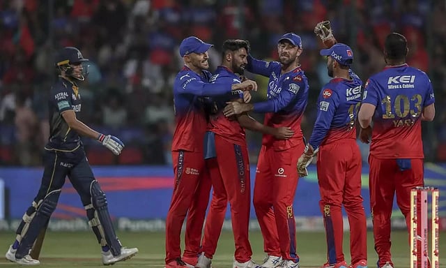 பெங்களூரு சின்னசாமி மைதானத்தில் நடைபெற்று வரும் போட்டியில் ஆர்சிபி- குஜராத் அணிகள் மோதி வருகின்றன. டாஸ் வென்ற ஆர்சிபி பந்து வீச்சை தேர்வு செய்தது.