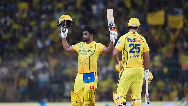 9-வது ஓவரை முகேஷ் குமார் வீசினார். முதல் பந்தில் சஞ்சு சாம்சன் 1 ரன் எடுத்து அரைசதம் அடித்தார். அவர் 26 பந்தில் 9 பவுண்டரிகளுடன் அரைசதம் அடித்தார். சிஎஸ்கே அணிக்காக சஞ்சு சாம்சன் அடித்த முதல் அரைசதம் இதுவாகும்.