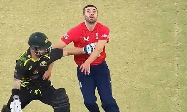 இந்நிலையில் இந்த போட்டியில் நடந்த ஒரு சம்பவம் சர்ச்சையை ஏற்படுத்தியுள்ளது. ஆஸ்திரேலியா அணி பேட்டிங் செய்த போது ஆட்டத்தின் 17-வது ஓவரை மார்க் வுட் வீசினார். அந்த ஓவரில் அவர் வீசிய 3-வது பந்தை மேத்யூ வேட் தூக்கி அடிக்க முயன்ற போது பேட்டில் டாப் எட்ஜாகி பவுலருக்கே கேட்ச்சாக சென்றது.