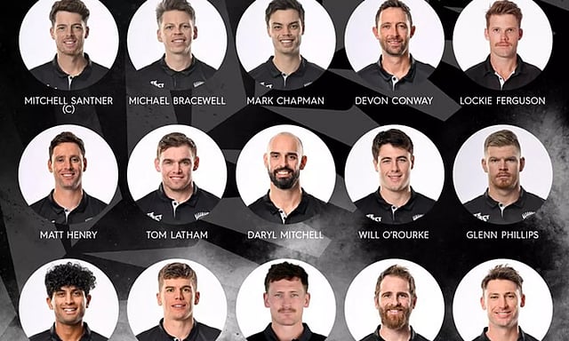 மிட்செல் சான்ட்னர் (கேப்டன்), மைக்கேல் பிரேஸ்வெல், மார்க் சாப்மன், டேவான் கான்வே, லாக்கி பெர்குசன், மேட் ஹென்றி, டாம் லாதம், டேரில் மிட்செல், வில் ஓ ரூர்க், கிளென் பிலிப்ஸ், ரச்சின் ரவீந்திரா, பென் சீயர்ஸ், நாதன் ஸ்மித், கேன் வில்லியம்சன், வில் யங்.
