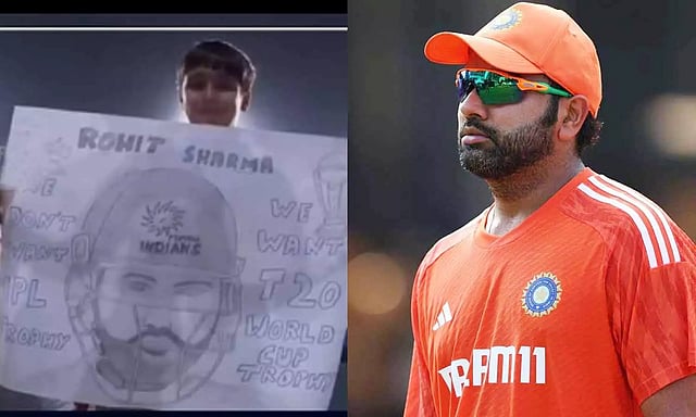 இந்நிலையில் நேற்றைய போட்டியில் குட்டி ரசிகர் ஒருவர் கையில் பாதகையை ஏந்தியபடி ரோகித் சர்மாவுக்கு ஒரு கோரிக்கை வைத்துள்ளார். அந்த பாதகையில் ரோகித் ஓவியம் வரையப்பட்டு இருந்தது. மேலும் அதில் எங்களுக்கு ஐபிஎல் கோப்பை வேண்டாம் டி20 உலகக் கோப்பை வென்று கொடுத்தால் போதும் என கூறப்பட்டிருந்தது. இந்த புகைப்படம் சமூக வலைதளங்களில் வைரலாகி வருகிறது.