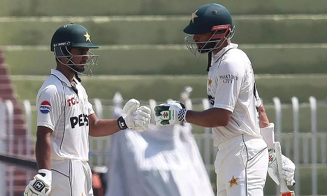 அடுத்து இறங்கிய கேப்டன் ஷான் மசூத், மற்றொரு தொடக்க ஆட்டக்காரர் சயீம் அயூப்புடன் ஜோடி சேர்ந்தார். இருவரும் பொறுப்புடன் ஆடி அரை சதம் கடந்தனர். இந்த ஜோடி 107 ரன்கள் சேர்த்த நிலையில் ஷான் மசூத் 58 ரன்னில் அவுட்டானார். அவரை தொடர்ந்து சயீம் அயூப் 57 ரன்னில் அவுட்டானார்.