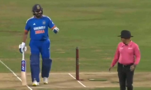 முதல் ஓவரில் இந்தியா 11 ரன்கள் எடுத்தது. இதில் ரோகித் பேடில் பட்டு 2 பவுண்டரி கிடைத்தது. இது நடுவரால் லெக் பைய்ஸ் கொடுக்கப்பட்டது. இதனால் முதல் ஓவர் முடியும் வரை ரோகித் 0 ரன்னில் இருந்தார். இதனையடுத்து 2-வது ஓவர் ஓமர்சாய் வீசினார். உடனே லெக் அம்பயராக இருந்த வீரேந்தர் சர்மாவிடம் இது குறித்து நக்கலாக ரோகித் பேசியது ஸ்டெம்ப் மைக்கில் தெளிவாக கேட்டது.