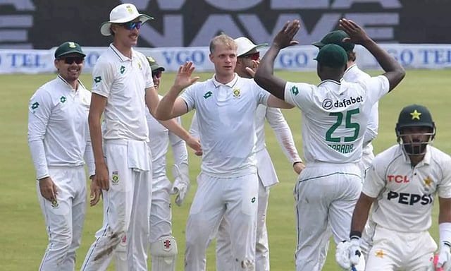 இறுதியில் பாகிஸ்தான் அணி 211 ரன்னில் ஆல் அவுட் ஆனது. தென் ஆப்பிரிக்கா தரப்பில் டேன் பேட்டர்சன் 5 விக்கெட்டும் கார்பின் போஷ் 4 விக்கெட்டும் வீழ்த்தினர்.