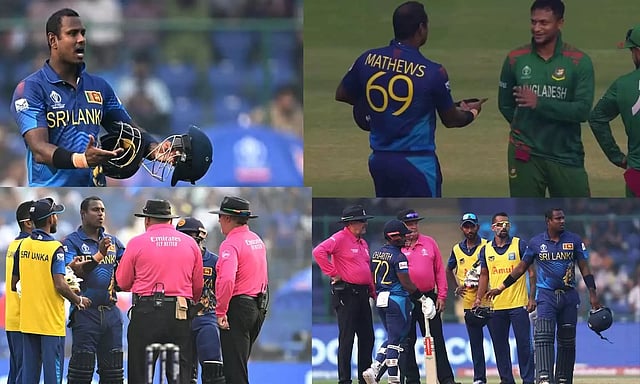 2023-ம் ஆண்டு உலகக் கோப்பை போட்டிக்கான விதிப்படி ஒரு வீரர் ஆட்டமிழந்தால் அடுத்து வரும் பேட்ஸ்மேன் 2 நிமிடங்களுக்குள் பந்தை எதிர் கொள்ள வேண்டும். மேத்யூஸ் உடனடியாக மைதானத்துக்கு வந்தாலும் பந்தை எதிர்கொள்வதில் தாமதம் ஏற்பட்டது. அவரது ஹெல்மெட்டில் பிரச்சினை இருந்ததால் மாற்று ஹெல்மெட் கொண்டு வரும்படி மற்ற இலங்கை வீரர்களிடம் கூறினார்.