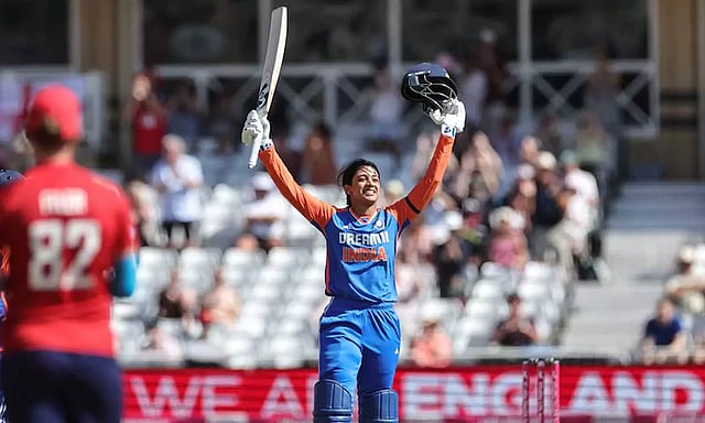 இங்கிலாந்து அணிக்கு எதிரான முதல் டி20 போட்டியில் சதம் விளாசியதன் மூலம், கிரிக்கெட் போட்டியின் ஒருநாள், டெஸ்ட் மற்றும் டி20 தொடர்களில் சதம் அடித்த இந்திய மகளிர் கிரிக்கெட் அணியின் முதல் வீராங்கனை என்ற சாதனையை ஸ்மிருதி மந்தனா படைத்தார்