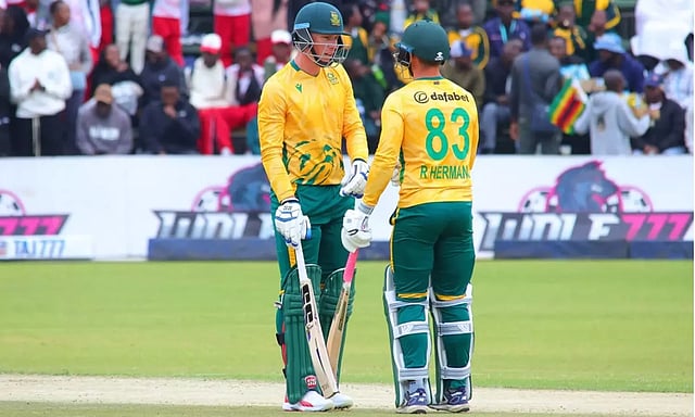 இதில் இன்று நடைபெற்ற 4-வது லீக் ஆட்டத்தில் ஜிம்பாப்வே, தென் ஆப்பிரிக்கா அணிகள் மோதின. டாஸ் வென்ற தென் ஆப்பிரிக்க அணி பந்துவீச்சை தேர்வு செய்தது.