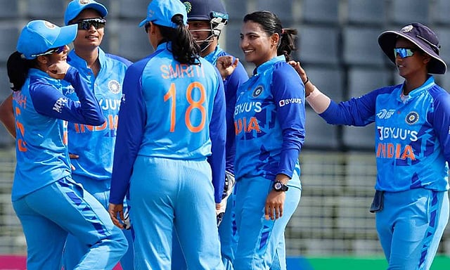 இந்திய தரப்பில் சினே ராணா 3 விக்கெட்டுகளையும் தீப்தி சர்மா ராஜேஸ்வரி 2 விக்கெட்டுகளையும் கைப்பற்றினார்.