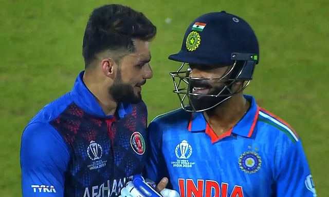 அப்போது ரசிகர்கள் மீண்டும் விராட் கோலி என கோஷமிட்டனர். அப்போது விராட் கோலி வேண்டாம் என கைசைகை மூலம் காட்டினார். இதனையடுத்து நவீன் உல் ஹக் ஓடி வந்து விராட் கோலியை கட்டியணைத்து இருவரும் கைகுலுக்கி சிரித்தனர். இந்த செயல் நெகிழ்ச்சியை ஏற்படுத்தியது. இந்த வீடியோ சமூக வலைதளங்களில் வைரலாகி வருகிறது.