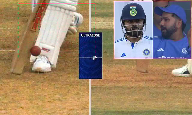 ஆனால் ரீபிளே-யில் பந்து பேட்டில் பட்டபிறகுதான் பேடை தாக்கியது தெரியவந்தது. இதனால் டி.ஆர்.எஸ். கேட்காமல் விராட் கோலி பரிதாபமாக ஆட்டமிழந்தார். இதை பார்த்துக் கொண்டிருந்த ரோகித் சர்மா, என்னப்பா இது? டி.ஆர்.எஸ். கேட்டிருக்கலமே... என்ற வகையில் ரியாக்ஷன் கொடுத்தார். இது இணையதளத்தில் வைரலாகி வருகிறது.
