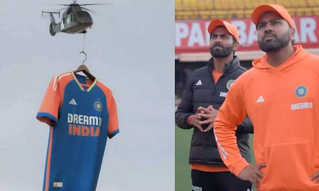 இந்த நிலையில் டி20 உலகக் கோப்பைக்கான இந்திய அணியின் புதிய ஜெர்சியை பிசிசிஐ அறிமுகப்படுத்தி உள்ளது. இந்த ஜெர்சி ஹெலிகாப்டரில் தொங்க விட்டு தரம்சாலாவில் உள்ள மைதானத்தில் வருவது போல வீடியோ வெளியிடப்பட்டுள்ளது. அதனை ரோகித் சர்மா, ஜடேஜா, குல்தீப் யாதவ் ஆகியோர் பார்ப்பது போன்ற காட்சி இடம்பெற்றுள்ளது.