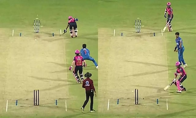 கீப்பர் திசையில் இருந்த ஸ்டெம்பில் பட்டு பவுலர் திசையில் இருந்த ஸ்டெம்பிலும் பட்டு வீரர் ரன் அவுட் ஆன வீடியோ சமூக வலைதளங்களில் வைரலாகி வருகிறது.