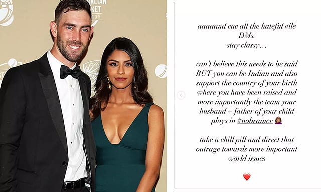இந்நிலையில் ஆஸ்திரேலியா வெற்றி பெற்றதை மேக்ஸ்வெல் மனைவி வினி ராமன் தனது இன்ஸ்டாகிராம் பக்கத்தில் பதிவிட்டிருந்தார். இந்த பதிவிற்கு இந்திய ரசிகர்கள் அருவருக்கத்தக்க மெசெஜ்களை அனுப்புவதாக வினி ராமன் குற்றம் சாட்டி உள்ளார்.