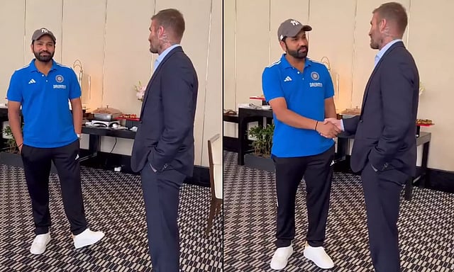 இந்த நிலையில், நேற்றைய போட்டியில் வெற்றி பெற்ற இந்திய அணி கேப்டன் ரோகித் சர்மாவை டேவிட் பெக்காம் சந்தித்து பேசியுள்ளார். சந்திப்பின் போது, ரோகித் சர்மா ஜெர்சியை டேவிட் பெக்காமும், டேவிட் பெக்காமின் ஜெர்சியை ரோகித் சர்மாவும் அணிந்து புகைப்படம் எடுத்துக் கொண்டனர். இந்த புகைப்படம் தற்போது வைரலாகி வருகிறது.