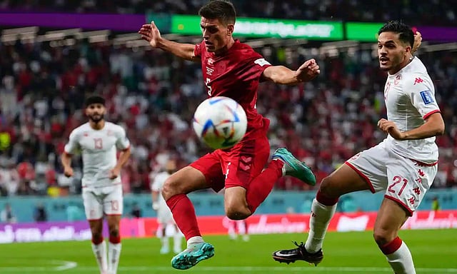 22-வது உலக கோப்பை கால்பந்து போட்டி கத்தாரில் நடைபெற்று வருகிறது. இந்தத் தொடரில் இன்று நடைபெற்ற ஆட்டம் ஒன்றில் டென்மார்க் - துனிசியா அணிகள் மோதின. ஆட்டம் தொடங்கியது முதல் இரு அணி வீரர்களும் கோல் அடிக்க கடுமையாக போராடினர்.