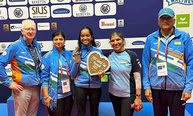 ஜெர்மனியில் நடைபெற்று வரும் உலகக்கோப்பை துப்பாக்கிச்சுடுதல் போட்டியில் 10 மீ ஏர் ரைபிள் மகளிர் பிரிவில் இந்திய வீராங்கனை இளவேனில் வாலறிவன் வெண்கலம் வென்று அசத்தியுள்ளார்.