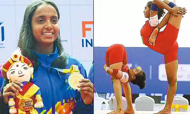 யோகாசனத்தில் ஆர்டிஸ்டிக் ஜோடி பிரிவில் உடலை வில்லாக வளைத்து சாகசம் காட்டிய தமிழக வீராங்கனைகள் மேனகா- பெட்ரா ஷிவானி 132.35 புள்ளிகளுடன் முதலிடத்தை பிடித்து தங்கமங்கையாக உருவெடுத்தனர். மராட்டிய ஜோடிக்கு வெள்ளிப்பதக்கம் கிடைத்தது. இதில் மேனகா விருதுநகரையும், ஷிவானி மதுரையையும் சேர்ந்தவர்கள். இருவரும் பிளஸ்1 படிக்கிறார்கள்.