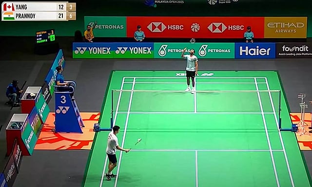 Match disrupted of HS Prannoy in Malaysia Open 2025 after water started leaking from the roof of the indoor stadium.Imagine this happening in India ?pic.twitter.com/pVNmTfYdMb