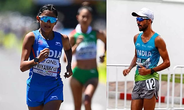 பாரீஸ் ஒலிம்பிக்கின் தடகள போட்டியில் இன்று காலை கலப்பு அணிகள் பிரிவுக்கான மாரத்தான் நடை பந்தயம் நடைபெற்றது. இதில் இந்தியா சார்பில் சுரஜ் பன்வார்- பிரியங்கா ஜோடி கலந்து கொண்டது.