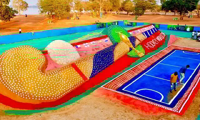 ஒடிசா மாநிலத்தில் உலக கோப்பை ஹாக்கி போட்டிகள் நடைபெற்று வருகின்றன. இப்போட்டியின் துவக்க விழாவின்போது மணல் சிற்பக் கலைஞர் சுதர்சன் பட்நாயக் பிரமாண்டமான ஹாக்கி மட்டை மணல் சிற்பத்தை உருவாக்கி அனைவரின் கவனத்தையும் ஈர்த்தார். கட்டாக் மகாநதியின் கரையில் 105 அடி நீளத்தில் உருவாக்கப்பட்டுள்ள இந்த சிற்பத்தை 5000 ஹாக்கி பந்துகளை கொண்டு அலங்கரித்துள்ளார்.