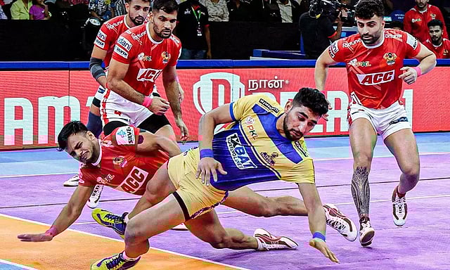 இந்நிலையில், இன்று இரவு 8 மணிக்கு நடந்த முதல் போட்டியில் தமிழ் தலைவாஸ், குஜராத் ஜெயண்ட்ஸ் அணிகள் மோதின. இதில் ஆரம்பம் முதலே ஆதிக்கம் செலுத்திய தமிழ் தலைவாஸ் புள்ளிகளை குவித்தது.