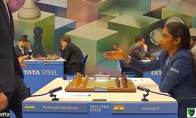 நெதர்லாந்தில் நடைபெற்று வரும் டாடா ஸ்டீல் செஸ் தொடரின் போட்டி ஒன்றில் இந்திய வீராங்கனை வைஷாலியை எதிர்த்து உஸ்பெகிஸ்தானை சேர்ந்த நோடிர்பெக் விளையாடினார். இந்தப் போட்டி துவங்கும் முன் நோடிர்பெக் வைஷாலிக்கு கை குலுக்க மறுத்த சம்பவம் சலசலப்பை ஏற்படுத்தி இருக்கிறது.