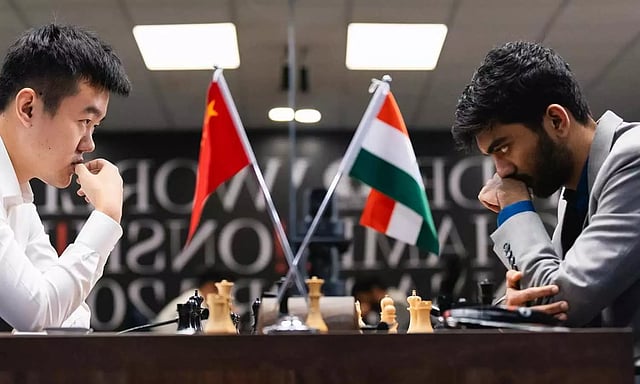 சிங்கப்பூரில் நடைபெற்று வரும் உலக செஸ் சாம்பியன்ஷிப்பில் குகேஷ்- டிங் லிரென் இடையிலான 9-வது சுற்று ஆட்டமும் டிராவில் முடிந்தது/ World Chess Championship as the ninth game between Indian challenger D Gukesh and defending champion Ding Liren of China ended in yet another draw to still level on points here on Thursdayஉலக செஸ் சாம்பியன்ஷிப் இந்தியாவின் ஜி. குகேஷ்- சீனாவின் டிங் லிரென் இடையே சிங்கப்பூரில் நடைபெற்று வருகிறது. 8 சுற்றுகள் முடிவில் இரண்டு பேரும் 4 புள்ளிகளுடன் சமநிலையில் இருந்தனர். 8 சுற்று போட்டிகளில் இருவரும் தலா ஒரு சுற்றில் வெற்றி பெற்றிருந்தனர். மற்று 4 சுற்றுகளும் டிராவில் முடிந்திருந்தனர்.