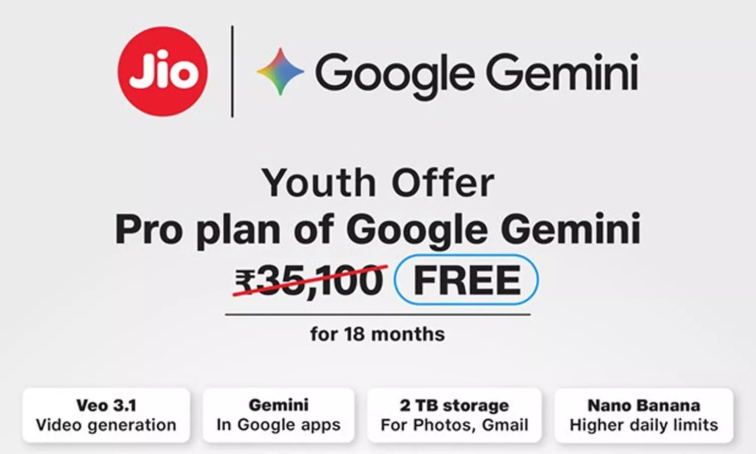 18 மாத காலத்தில் தோராயமாக ரூ. 35,100 மதிப்புள்ள ஜெமினி ஏஐ ப்ரோ சேவை, ஆரம்பத்தில் ஒரு குறிப்பிட்ட பயனர் தளத்திற்கு (18 முதல் 25 ஆண்டுகள் வரை) விரிவுபடுத்தப்பட்டு பின்னர் நாடு தழுவிய அளவில் விரிவடையும். இந்த ஆண்டின் தொடக்கத்தில் ஏர்டெல் நிறுவனம் பெர்ப்ளெக்ஸிட்டியுடன் இணைந்து ஒரு வருட இலவச பெர்ப்ளெக்ஸிட்டி ப்ரோ சந்தாவை வழங்கிய நிலையில், தற்போது ஜியோ இதுபோன்ற அறிவிப்பை வெளியிட்டுள்ளது.