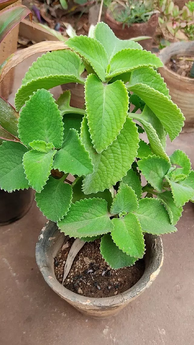 கற்பூரம் மற்றும் ஓம நறுமணம் உள்ள இந்தச் செடியின் இலைகள் நீர்ச்சத்து நிறைந்து தடித்து இருக்கும்.