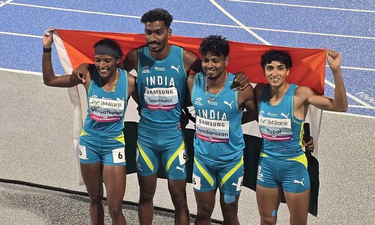 சுபா வெங்கடேசன், சந்தோஷ், விஷால் ஆகியோர் இந்திய கலப்பு ரிலே அணியில் தங்கம் வென்றனர். .