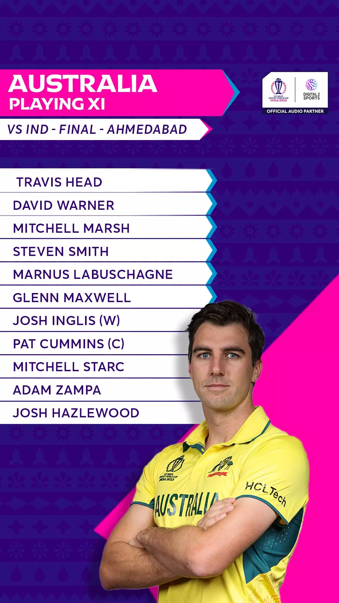 ஆஸ்திரேலியா அணி: டிராவிஸ் செட், டேவிட் வார்னர்,... ... உலகக் கோப்பை பைனல் லைவ் அப்டேட்ஸ்: ஆஸ்திரேலியா 43 ஓவரில் இலக்கை எட்டி சாம்பியன் பட்டம் வென்றது.