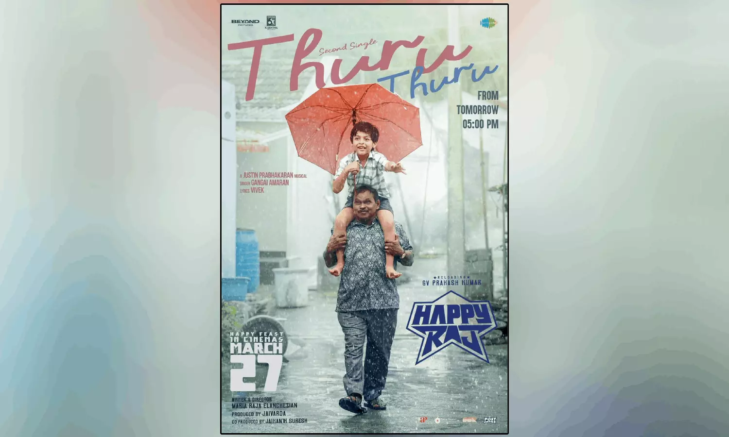 அதன்படி ஹேப்பி ராஜ் திரைப்படத்தின் இரண்டாவது சிங்கிள் `துரு துரு' நாளை மாலை 5.00 மணிக்கு வெளியாகும் என்று அறிவிக்கப்பட்டு இருக்கிறது. இந்தப் பாடலை விவேக் எழுத, கங்கை அமரன் பாடியுள்ளார். முதல் பாடலை போன்றே இரண்டாவது பாடலும் பெரும் வரவேற்பை பெறும் என்று தெரிகிறது.